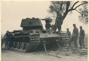 Танк КВ-1 зр. 1940-го зі складу 16-го ТП 8-ї ТД 4-го МК РККА Покинутий в околицях Львова, в селі Рясне-Руське Обнюхують його єгері з 1-ї ГПД ”Едельвейс” Вермахта