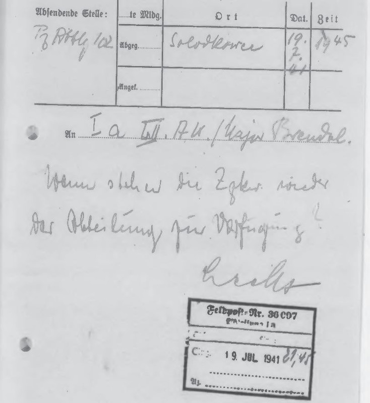 По всей видимости батальону выделялись тягачи собирать вышедшую в ходе марша технику. Батальон с 17 по 21 находился в Солобковцах, на 22 переместился в Жмеринку. И если на 17 в батальон 3 исправных танка, то к 21 на ходу уже 7 машин. А в Жмеринке уже всего 5.